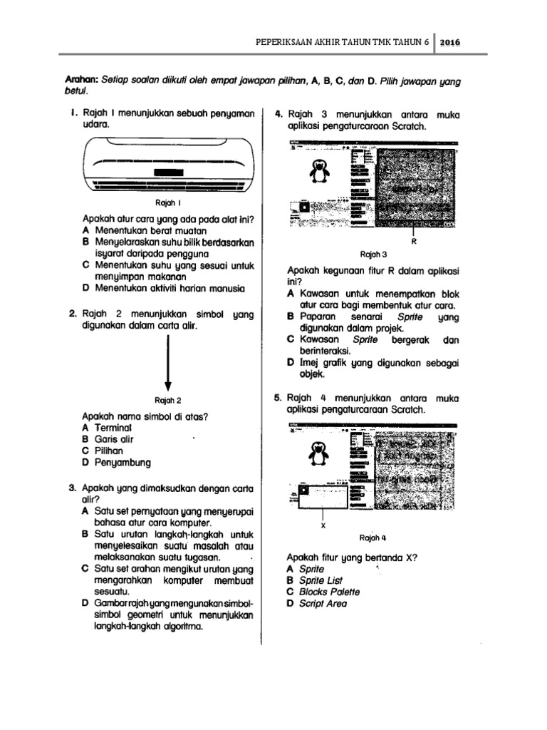 Berikut adalah contoh soalan dan skema jawapan bagi pengaturcaraan tmk tahun 6. Soalan akhir tahun tmk tahun 4. SULIT 2018-PPT-TMK-T6 1 SULIT BAHAGIAN A 15 Markah Arahan.